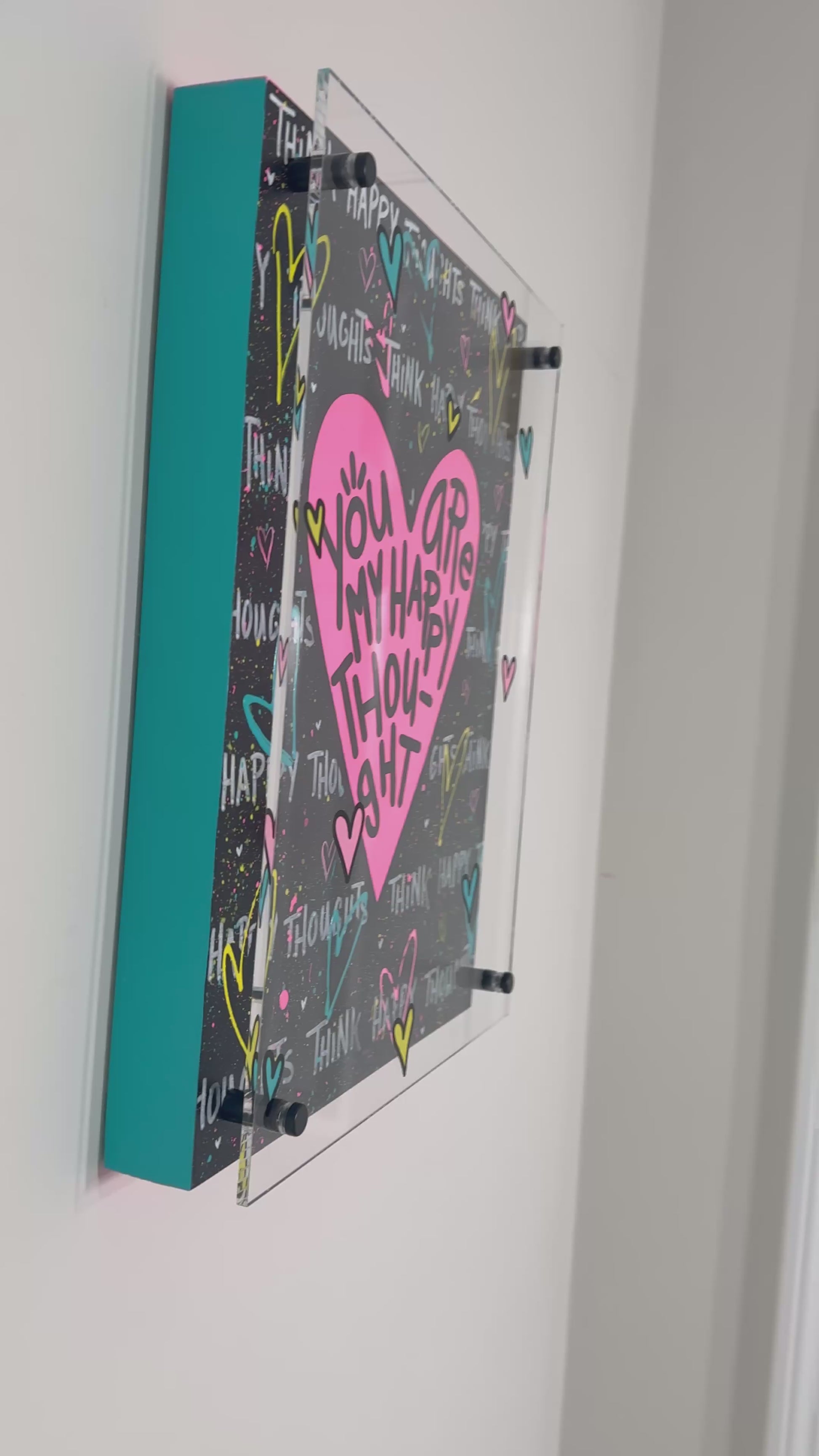A hand-painted floating layer of plexiglass adds even more dimension and fun, bringing the artwork to life with depth, movement, and a little extra love.